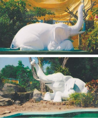လျောင်းတော်မူဘုရားကြီး၏ မျက်နှာတော်ဘက်ရှိ ရင်ပြင်တော်အတက် လှေကား ကြီး၏ ဝဲယာတွင် တစ်ဖက် တစ်ကောင်စီဖြင့် နှာမောင်းတော်ကို ဦးခေါင်းပေါ်တွင် မြှောက်၍ ခြေလက်စုံ ဝပ်တွားကာ ဘုရားကြီးအား ဦးခိုက် ဖူးမြှော်နေပုံကို ထုလုပ် သွန်းလောင်းထားပါသည်။